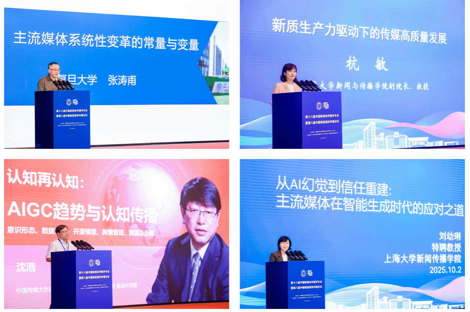 主旨论坛上,来自同行高校、相关领域企业的专家学者围绕如何推进主流媒体系统性变革、智能传播范式与生态变迁、人工智能隐私与信任问题等展开演讲,上海大学新闻传播学院吴信训教授、周宇豪教授担纲主持。