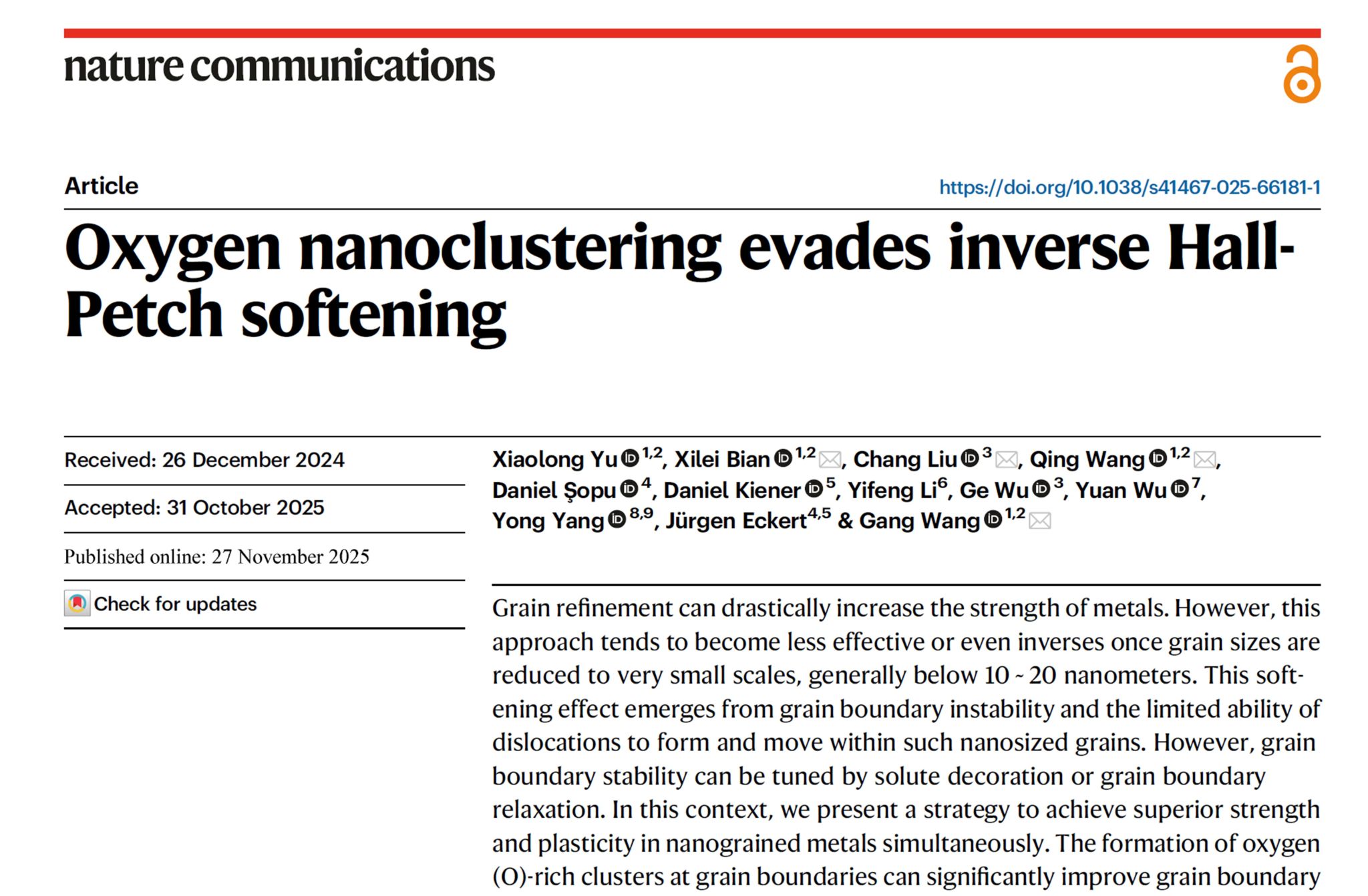 在此背景下,上海大学核电关键材料全国重点实验室固定成员卞西磊副研究员指导2024级博士研究生俞潇龙,在纳米尺度(晶粒尺寸小于20纳米)核电用关键金属材料强韧化领域取得重要研究进展。相关成果以“Oxygen nanoclustering evades inverse Hall-Petch softening”为题,在线发表于国际顶级学术期刊《自然·通讯》(Nature Communications 16, 10602 (2025))(影响因子:15.7)。同行评议中,两位审稿人分别给予高度评价:“a piece of quite comprehensive work”(一个非常全面的工作);“presents an interesting and intriguing finding”(呈现了一个有趣且引人入胜的发现)。该研究工作由上海大学联合西安交通大学、奥地利科学院Erich Schmid材料研究所、香港城市大学及北京科技大学等多家单位合作完成。上海大学为论文第一完成单位和通讯单位。上海大学材料科学与工程学院2024级博士生俞潇龙论文为第一作者,上海大学卞西磊副研究员、王刚教授、王庆研究员和西安交通大学刘畅教授为共同通讯作者。