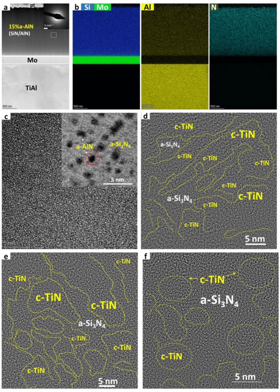 图1 15% a-AlN(a-Si₃N₄/a-AlN)和61-88%c-TiN(a-Si₃N₄/c-TiN)涂层的微观结构与元素分布(详细图注信息见原文)