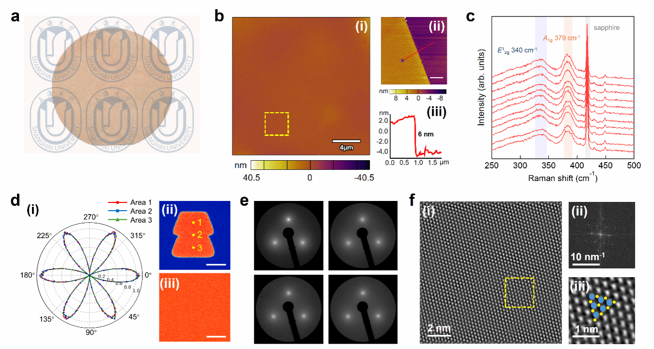 图2|晶圆级NbS₂单晶薄膜。a,生长于2英寸蓝宝石衬底上的NbS₂薄膜实物照片。b,(i)NbS₂在蓝宝石基底上的原子力显微镜(AFM)图像。黄色方框所示区域为均方根(RMS)表面粗糙度计算区域。(ii)NbS₂在蓝宝石基底上的AFM图像,通过人为划痕显示NbS₂与蓝宝石衬底之间的高度对比。比例尺:1 μm。(iii)是(ii)中对应线段的高度剖面,显示NbS₂薄膜厚度约为6 nm。c,室温条件下在2英寸NbS₂样品上进行的拉曼线扫描谱图,共采集11个光谱,测量间距为5 mm。d,(ii)与(iii)分别为合并NbS₂畴区(比例尺:5 μm)和连续NbS₂薄膜区(比例尺:10 μm)的偏振分辨二次谐波(SHG)成像。(i)为(ii)中标示的三个区域对应的SHG强度极坐标图(角度单位:°)。e,在2英寸NbS₂薄膜不同位置采集的典型低能电子衍射(LEED)图样。f,NbS₂薄膜的扫描透射电子显微镜(STEM)图像,显示其2H多型堆垛的晶格结构及对应的快速傅里叶变换(FFT)图像。(iii)为(i)中黄色虚线框区域的放大图像,其中蓝色球表示Nb原子,黄色球表示S原子。