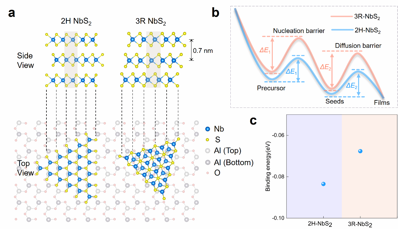 图3|衬底引导的2H-NbS₂选择性生长机制。a,2H相与3R相NbS₂在蓝宝石衬底上的原子结构模型。两种相均由Nb原子处于三角棱柱配位构成,但在层间堆垛方式上存在差异。下方展示了2H-NbS₂与c面蓝宝石六方晶格之间的外延界面关系,突出其晶格对称性匹配特征。b,生长过程中结合能的计算示意图。其中,ΔE₁表示NbS₂在蓝宝石台阶边缘处的成核结合能,ΔE₂表示畴横向扩展过程中吸附原子“攀爬”台阶时的结合能。相较于3R相,2H-NbS₂在两种能量项上均表现出更有利的结合特性,表明其在成核及吸附原子的动力学方面具有优势。c,2H相与3R相NbS₂在蓝宝石台阶上的形成能比较。在薄膜厚度为6 nm时,2H相的形成能为−0.0835 eV,明显低于3R相的−0.0676 eV,从而解释了实验中观察到的高相纯2H-NbS₂生长结果。