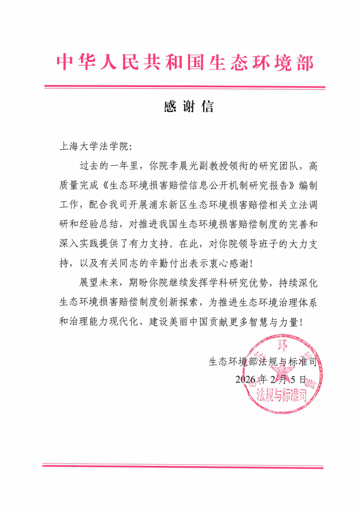 近日,生态环境部法规与标准司向法学院发来感谢信,对法学院环境法研究团队在生态环境损害赔偿制度研究与实践推进中作出的贡献表示高度赞赏与诚挚感谢。感谢信中指出,李晨光副教授高质量完成《生态环境损害赔偿信息公开机制研究报告》编制工作,配合生态环境部法规与标准司开展浦东新区生态环境损害赔偿相关立法调研和经验总结,对推进我国生态环境损害赔偿制度的完善和深入实践提供了有力支持。信中对我院领导班子的大力支持以及有关同志的辛勤付出表示衷心感谢,期盼上海大学法学院继续发挥学科研究优势,持续深化生态环境损害赔偿制度创新探索,为推进生态环境治理体系和治理能力现代化、建设美丽中国贡献更多智慧与力量。