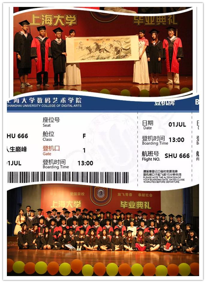 爱国荣校、毕业思源,为表达对母校的感恩情怀,毕业生精选《八骏马图》赠送学院,祝福母校如骏马腾飞,奔向光明的未来,仲星明和陈大明接收了毕业生赠礼。伴着高亢嘹亮的《上海大学校歌》,数码艺术学院2016届毕业生毕业典礼在不舍中落下帷幕,今朝相聚时虽短,友情似水长;明朝别离奔四方,歌声满行囊;希望即将展翅翱翔的数码学子们牢记上海大学“自强不息”、“先天下之忧而忧,后天下之乐而乐”的校训,带着数码师生的殷切嘱托,唱响生命中最美的乐曲,掀起人生旅途中一个又一个高潮。