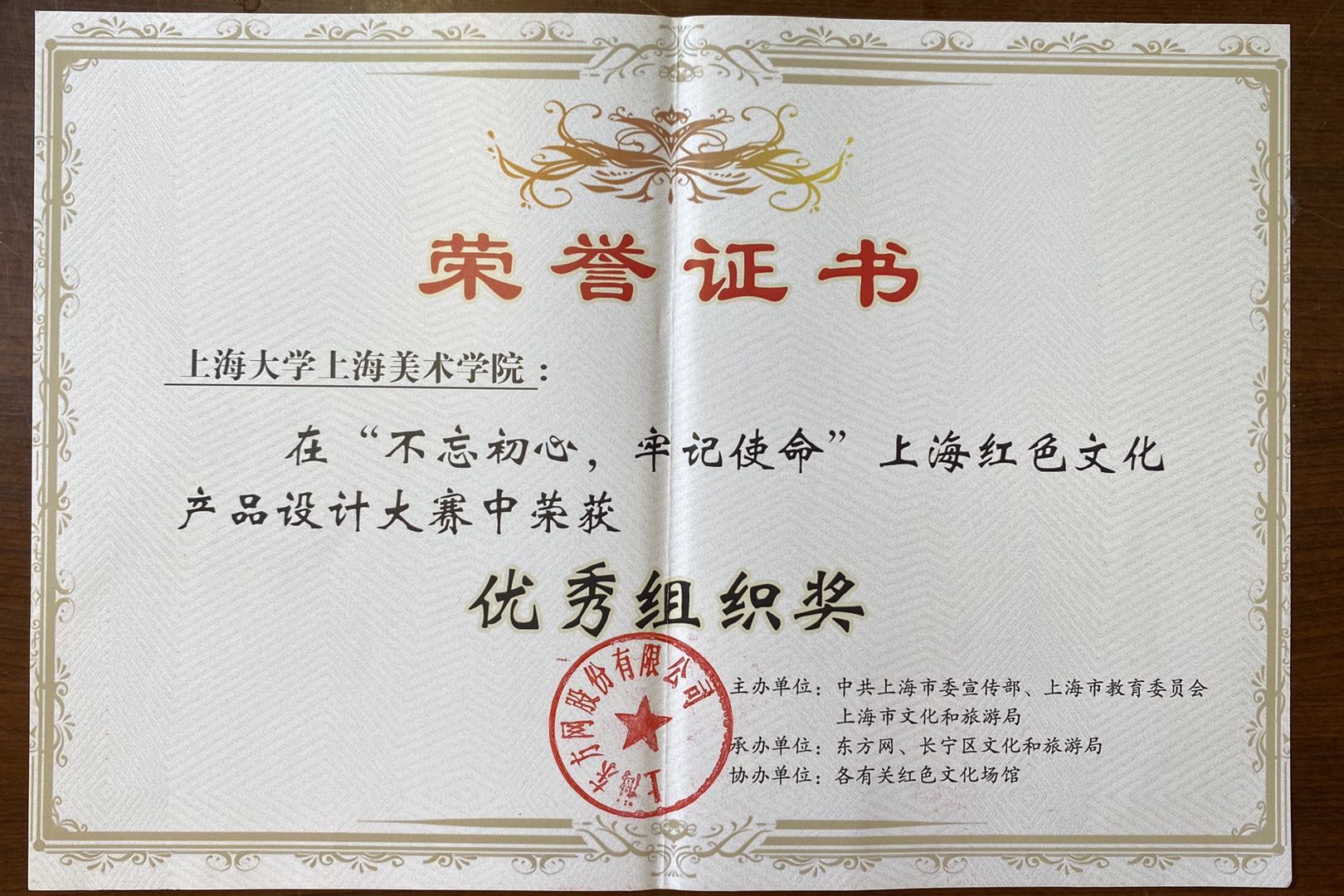 上海大学上海美术学院积极组织师生参与,荣获“第一届上海红色文化创意大赛”优秀组织奖,学院党委副书记王岭山代表学院领奖。