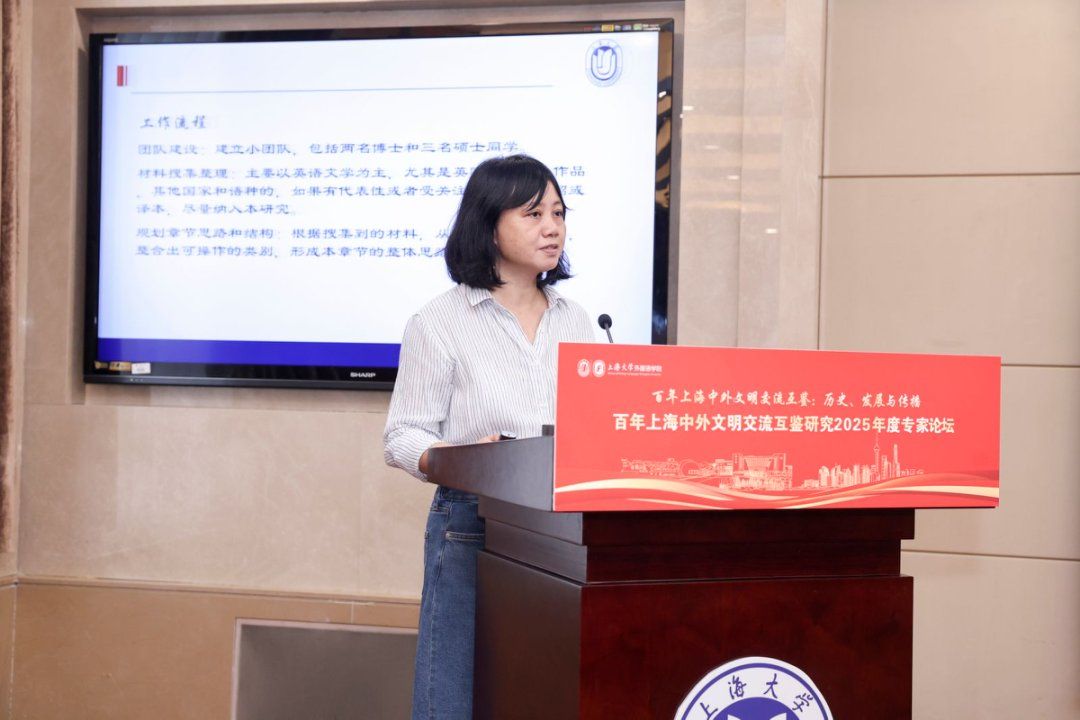 文化上海版块主旨报告由外国语学院副院长张建琴副教授主持。上海大学外国语学院王资博士发言。她从汉学的广义概念切入,系统回顾了1979至2012年英美两国汉学研究的社会背景、演进脉络与代表人物,最后将视野聚焦于上海,提出上海可成为推动外交的平台、培养学者的摇篮及深化学术研究的重要对象。西安外国语大学欧洲学院齐赵园副教授聚焦20世纪初至1949年法国汉学,系统勾勒了从旧汉学至新汉学的转型、沙畹学派的核心贡献及其他法国汉学家的研究,剖析了二战引发的学术断裂是法国汉学衰落的主因,并提出一种编年与专题相结合的“混合模式”,倡导在历史脉络与动态发展的双重视角下,构建更为完善的汉学研究框架。