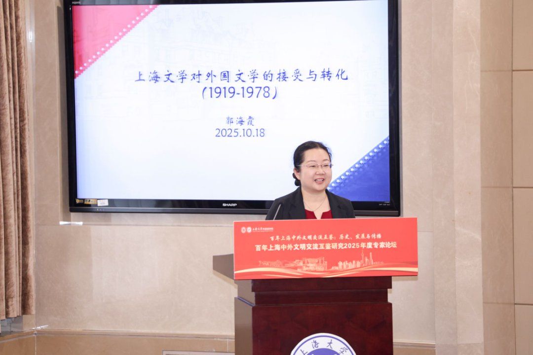 秋日泮池,碧波荡漾,思想交融。10月18日,上海大学外国语学院在上海大学宝山校区乐乎新楼学海厅举行“百年上海中外文明交流互鉴:历史、发展与传播——百年上海中外文明交流互鉴研究2025年度专家论坛”,本次论坛由上海外语教育出版社、上海市外文协会协办。第十三届、十四届全国政协常委、西安外国语大学原校长户思社教授,上海外语教育出版社社长助理高云松,上海外语教育出版社田慧肖、杨洋,西安外国语大学齐赵园、朱维嘉,华东理工大学陈丽、何玮,上海海事大学郭海霞、张宏雨、莫为,上海外国语大学张彩迪,河南安阳工学院郭欣,山东科技大学伊丹丹,上海大学刘娇蕾等校内外学者,学院党政领导班子及师生代表等出席此次会议。