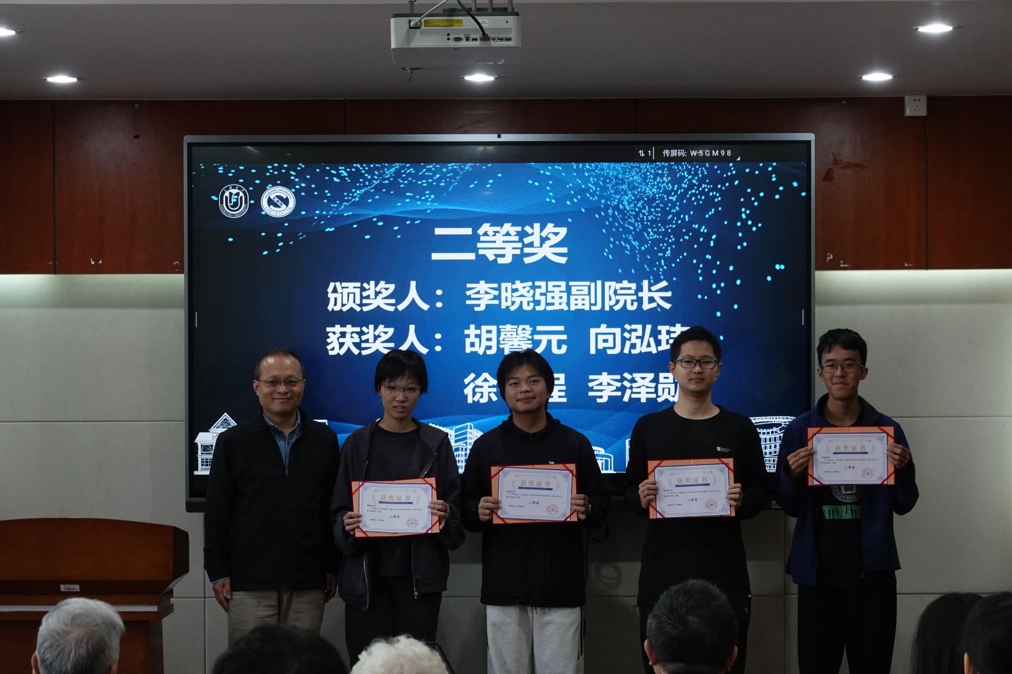 第二组是学院原党委书记徐炜民与2024级计算机科学与技术专业本科生杨旭晨、2025级计算机科学与技术第七党支部书记硕士生龚辰、博士研究生第二党支部书记黄知秋结对。赖练副书记代为赠书,并与同学合影留念。