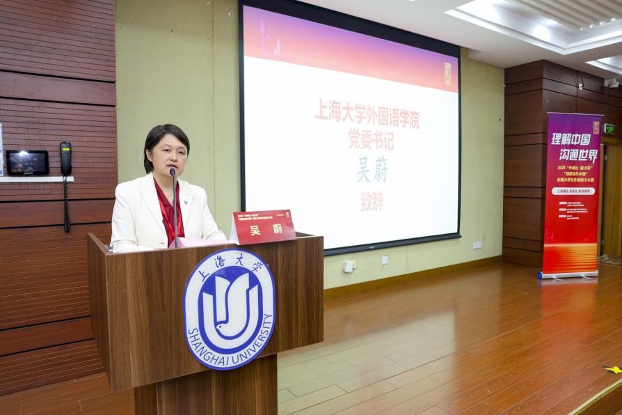 外国语学院党委书记吴蔚在致辞中表示,“外研社·国才杯”是我国外语教育领域最具权威性的标杆赛事,系统性地培养兼具家国情怀、全球视野与专业本领的实战型拔尖外语人才。她强调,学院始终秉持“自强不息,道济天下”的校训,承办这样一场高水平的演讲比赛,正契合了学院培养“中国灵魂、全球视野”高素质外语人才的理念。大赛主题抒写了新时代青年的青春风采与奋斗气概,也是将“外语+中华/海派文化+国际传播”融合理念转化为实践的舞台。