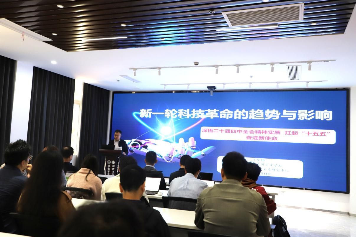 接着,上海大学马克思主义学院副教授王金伟作主题为“新一轮科技革命的趋势与影响”的专题辅导报告。王金伟教授从全球科技发展大势出发,深入剖析了新一轮科技革命的核心驱动力、主要特征及深远影响,特别是对微电子领域带来的机遇与挑战。他结合党的二十届四中全会关于“十五五”时期实施科教兴国战略、人才强国战略、创新驱动发展战略的部署,阐述了高校特别是微电子学院在抢占科技制高点、实现高水平科技自立自强中的使命担当。报告内容视野开阔、分析透彻,引发了与会师生的深入思考和热烈讨论。