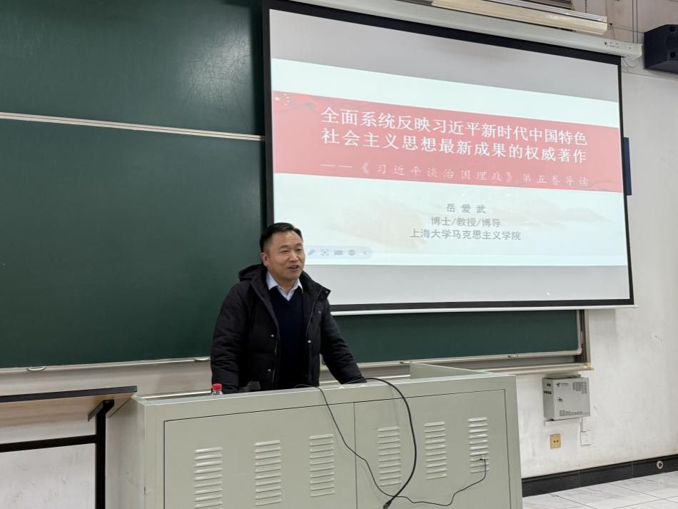 马克思主义学院岳爱武教授以《全面系统反映习近平新时代中国特色社会主义思想最新成果的权威著作——<习近平谈治国理政>第5卷导读》为题做专题辅导报告。岳教授把第一卷至第五卷作为一个整体进行讲解,全面、系统、动态地展现了习近平新时代中国特色社会主义思想的发展脉络和科学体系,并着重从第五卷出版的历史背景、总体框架、重大论断等方面解读全书逻辑结构、基本内容。岳教授表示,要在学懂弄通做实第五卷上下功夫,要全面系统学、抓住重点学、深入贯彻学。