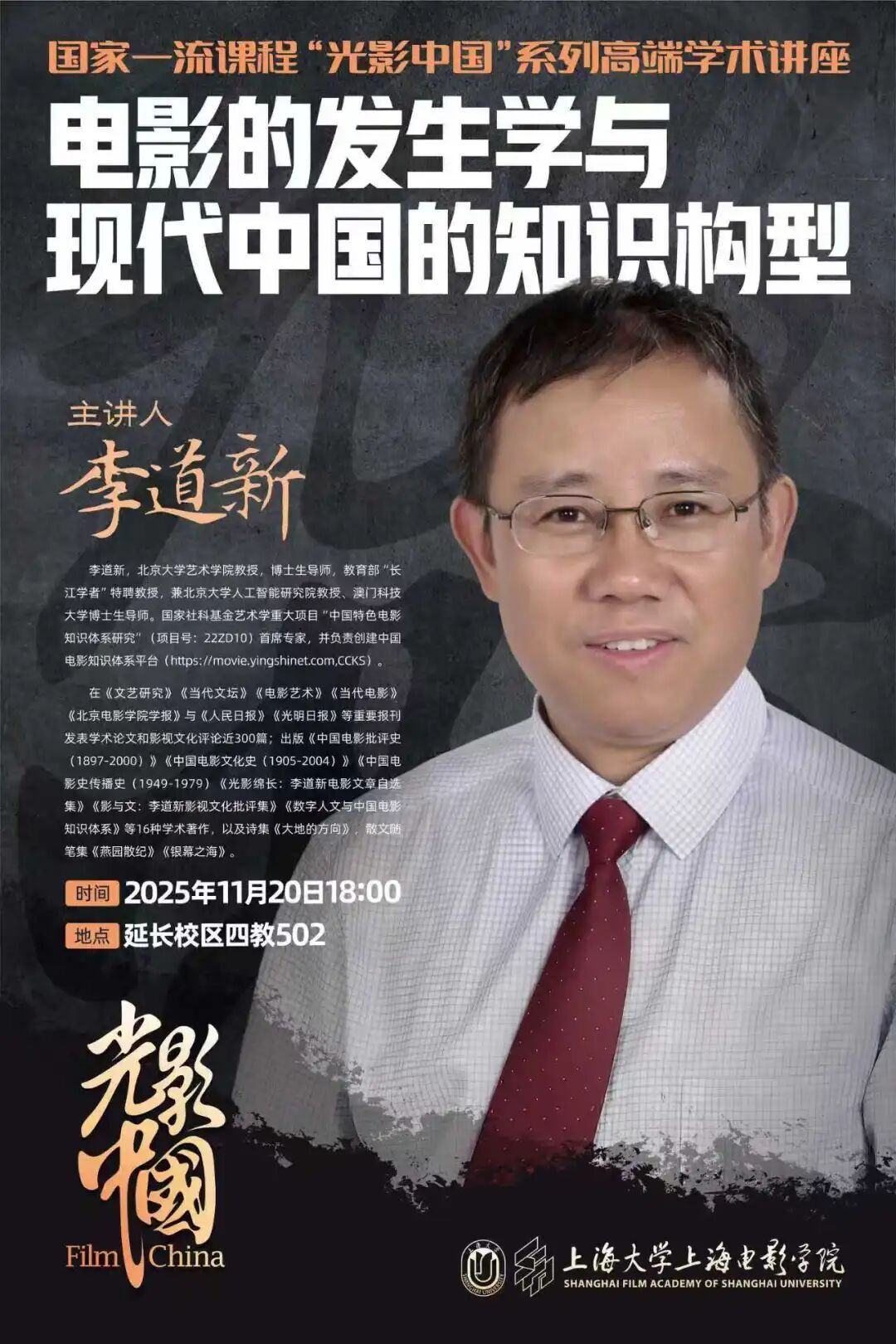 11月20日,国家一流课程“光影中国”系列高端学术讲座拉开帷幕,由北京大学艺术学院副院长、教授、博士生导师,教育部“长江学者”特聘教授——李道新先生为上海电影学院师生带来的《电影的发生学与现代中国的知识构型》高端学术讲座成功举办。