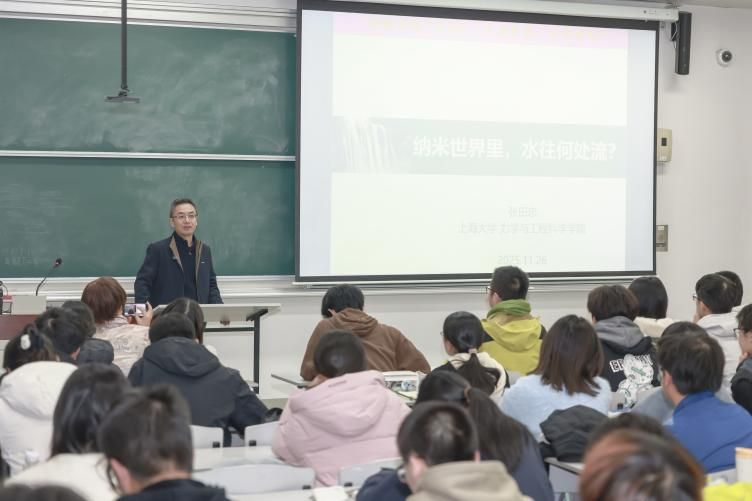 张田忠教授以“纳米世界里,‘水’往何处流”为主题,揭开微观力学的神秘面纱。他从宏观世界的重力规律讲起,对比引出纳米尺度下的特殊现象,回应“大国重器与纳米世界的关系”问题。他用生动的课件视频、图片等,演示了在纳米尺度,重力影响减弱,表面作用凸显,“水”会向温度低、能量低的区域移动,甚至能沿固体表面实现定向流动。“科学研究向极宏观拓展、向极微观深入、向极端条件迈进、向极综合交叉发力,不断突破人类认知边界。”对标“四极”要求,张老师分享了团队通过模拟实验发现的温度、刚度、曲率、波动等因素对微观流体的影响,以及基于这些发现设计转动马达、纳米水泵的创新思路,让学生直观感受到“小尺度里有大天地”,基础研究的突破能带来全新的技术变革。最后,张老师抛出一系列与力学相关的生活谜题:飞蛾为何扑火?水黾何以水上漂?荷叶为何能自清洁?他启发同学们,日常生活中司空见惯的现象,其既定答案未必全然准确,唯有保持好奇、多问“为什么”,才能探索到现象背后的科学本质。正如上海大学老校长钱伟长先生所言:“没有科研做底蕴的教育,是没有灵魂的教育”,张教授以自身研究实践,诠释了科研与教育深度融合的育人真谛。