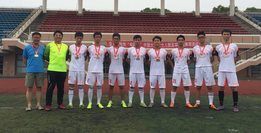 2016“校园杯”中国大学生七人制足球挑战赛暨上海高校省内挑战赛昨日在上海工程技术大学落下帷幕。参加这次上海赛区的八强学校是:复旦、交大、财大、工技大、应技大、华政、华理和上大。代表各高校参赛的都是校内的冠军学院队。代表上海大学出战的理学院足球队在学院副书记刘亮老师和领队兼教练沈强老师的带领下,不畏强手,一路过关斩将,决赛中与工技大相遇,3:3打平后,点球惜败东道主,获得亚军。