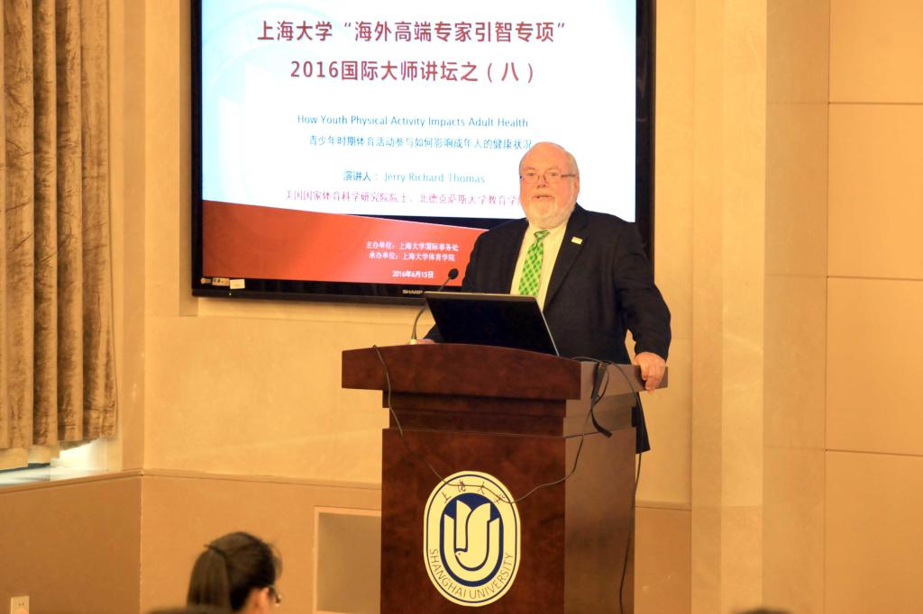 2016年6月15日下午3点,上海大学“海外高端专家引智专项”2016国际大师讲坛之(八)于宝山校区乐乎新楼学海厅成功举行。美国国家体育科学院院士、北德克萨斯大学教育学院院长Jerry Richard Thomas为我校师生做了题为“青少年时期体育活动参与如何影响成年人的健康状况”的精彩报告。此次演讲由上海大学体育学院程杰教授主持,来自美国北德克萨斯大学的张涛博士担任翻译。本期讲座吸引了全校众多院系的教师、本科生、研究生近150人,多名外教也参加了此次活动。