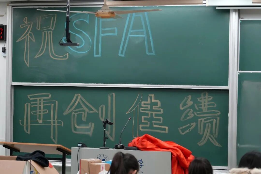 比赛前夕,暖意与专注交织。黑板上“祝SFA再创佳绩”的字样,是师生们共同的期许。