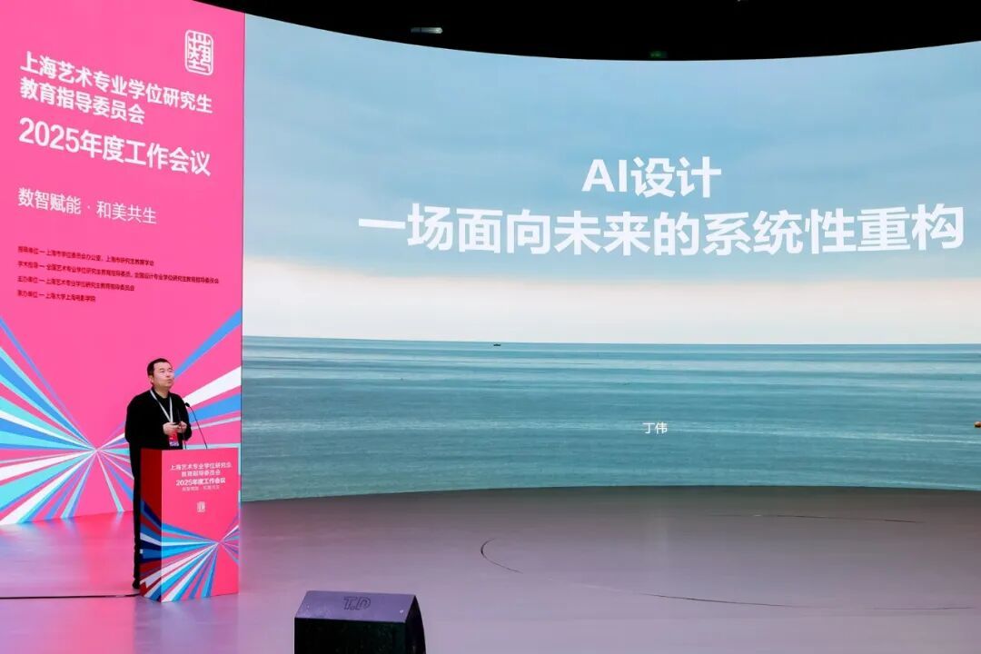 丁伟教授作“AI设计一场面向未来的系统性重构”讲座,从产业与学术视角出发,提出AI时代设计系统的“五维重构”(工具、流程、能力模型、组织架构、思维方式)、“五个回归”(提问、文本、草图表达、沟通、判断力)以及“五种可能”(超级个体、大设计、跨学科、拓展作品与认知边界),强调设计是一种唤醒,教育应激发学生内心热爱。