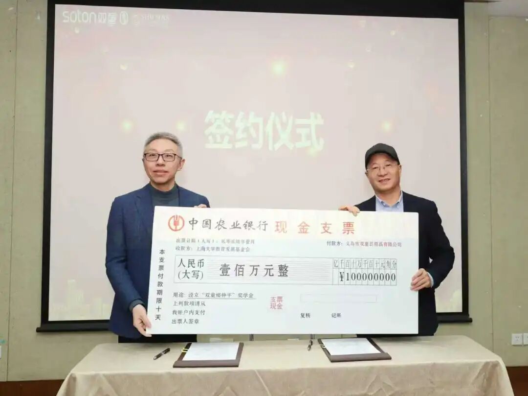 在全场嘉宾的见证下,陈方泉处长与楼仲平董事长分别代表上海大学与义乌双童集团正式签署捐赠协议。镇璐院长随后向楼仲平先生颁发了捐赠证书及奖杯,这不仅是对楼先生慷慨善举的表彰,更彰显了双方携手育人、共担社会责任的坚定决心。