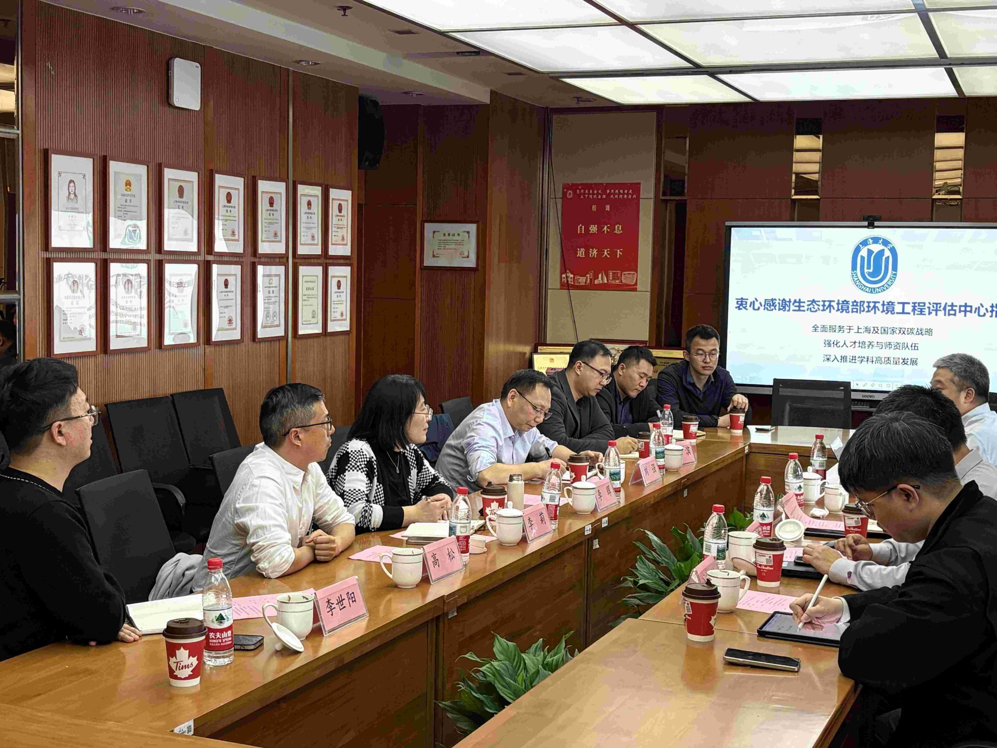 下午,双方在环化学院举行了座谈交流会。李莉副院长代表学院对评估中心一行的到访表示欢迎,并围绕“智启执法新篇,慧守生态底线”的主题,系统介绍了上海大学环境相关学科的建设进展。她重点分享了环境科学与工程、化学工程、核科学与技术、ESG等专业方向的发展情况,强调学院始终面向世界科技前沿、经济主战场、国家重大需求及人民生命健康,主动服务“美丽中国”建设和生态文明战略。学院立足优势特色学科,大力推进学科交叉融合,攻克关键核心技术,取得了一系列重要成果,为上海、长三角乃至国家层面重大环境与化工问题的解决提供了有力支撑。此外,李莉副院长还介绍了环境专业的国际化特色与人才培养成效。